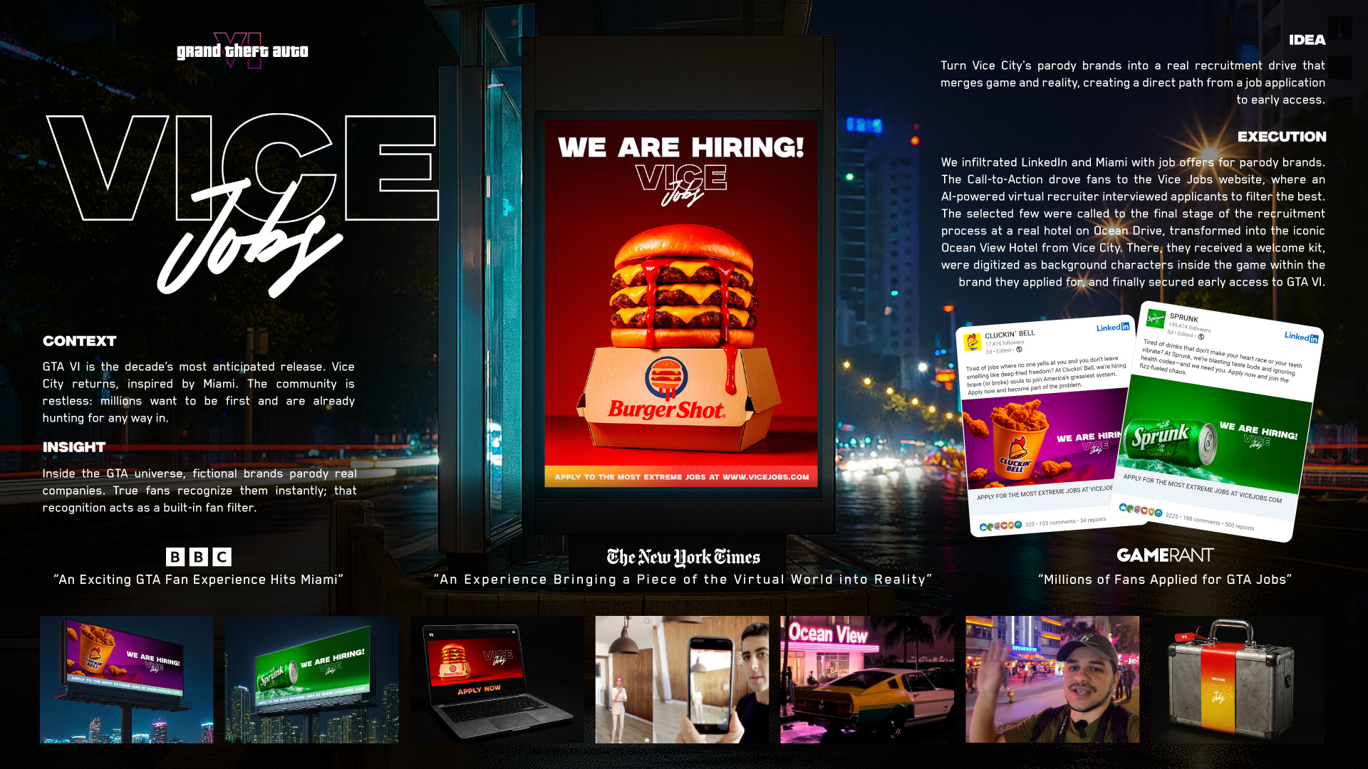 To launch the decade’s most anticipated title, traditional advertising felt redundant. We didn’t just advertise GTA VI, we hired for it. We infiltrated LinkedIn with real job postings for Vice City’s parody brands, using deep lore to filter true fans. The process escalated from AI-driven NPC interviews to a live experience inside the Ocean View Hotel, rebuilt to mirror its in-game twin. We made fiction tangible, rewarding the most dedicated recruits with exclusive Early Access and a permanent role as NPCs within the brands they applied for.
